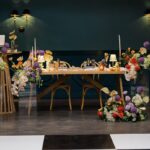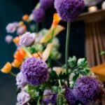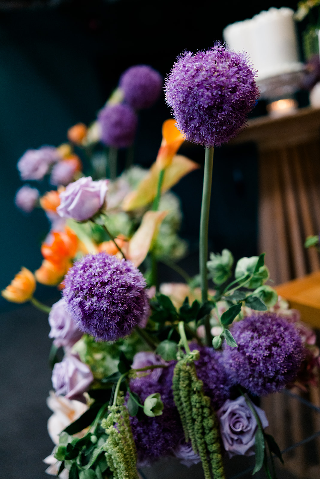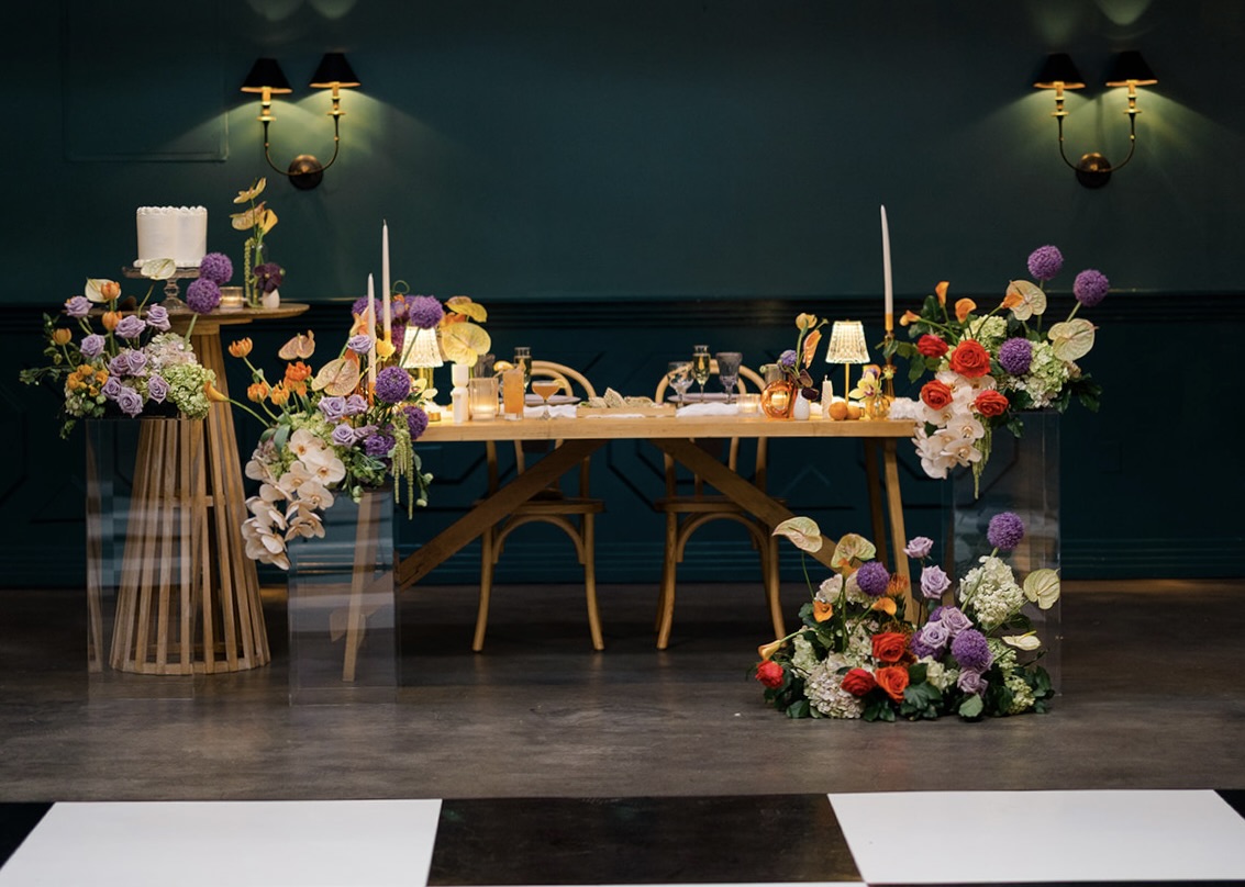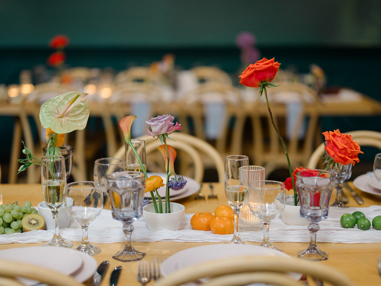 With that in mind, we intentionally leaned into color rather than playing it safe. Vibrant greens and saturated blues anchored the palette, layered with playful pops of coral and textured florals by Natalie Blooms. The floral installations weren’t just centerpieces—they became part of the venue’s architecture, moving with the space and amplifying its natural energy.