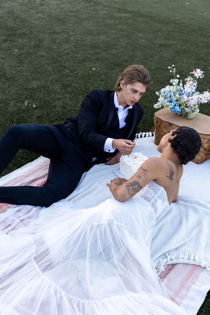Finally, we created a softer contrast to the architecture and scale of the estate. We styled a lakeside picnic scene that felt romantic, layered, and quiet—almost like the couple slipped away from the party for something private, slow, and beautiful.