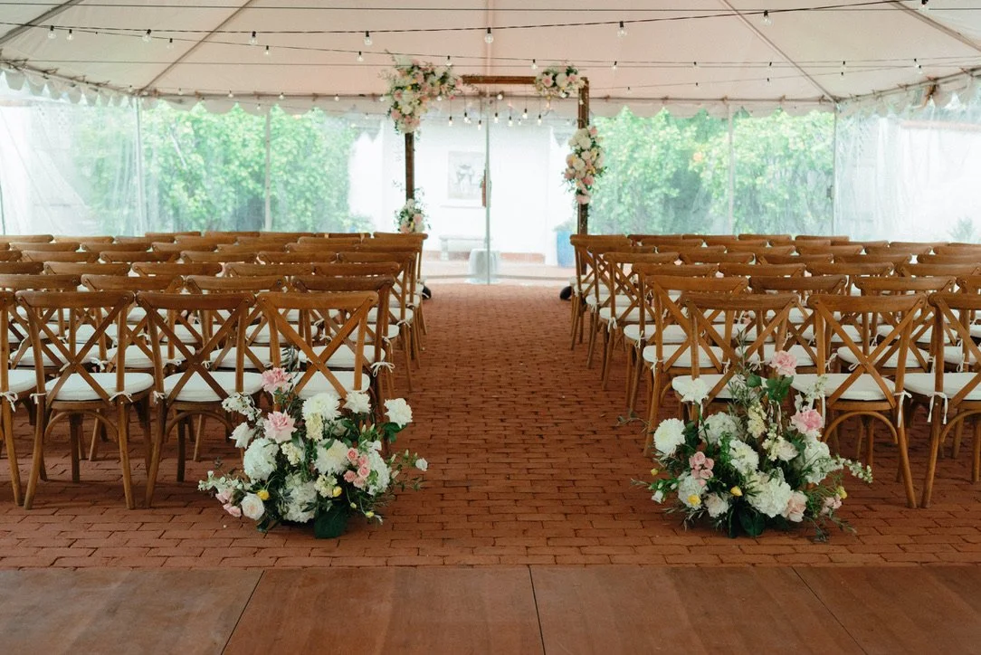Even with the weather, the ceremony layout stayed grounded and guest-focused. The aisle florals created softness and structure, while the seating kept the view open and elevated.